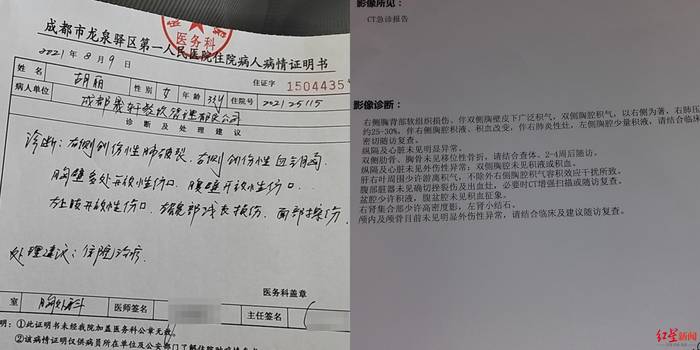求助信息上写道,胡丽全身有17处刀伤,其中:“胸腔被刺穿,肺部受损,胸部、腹部多处贯穿伤,左臂腋下动脉断裂,失血过多,血压一直处于休克水平,左臂骨折,左手无名指肌腱断裂,无法活动,后续至少还需要两次手术。”龙泉驿区第一人民医院出具的两份诊断资料也反映了以上部分伤情。