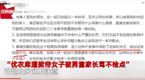 1月3日,河南信阳一女子在优衣库试衣间更衣,被两名男童多次猛推帘子。这次事件双方在交涉中,女子被男孩家长辱骂,双方发生冲突。不少网友称,“熊孩子”之所以有恃无恐,是因为家长教育不当,也有网友就儿童的性别意识展开讨论。5日,当事女子男友发声:事情发酵到现在这个程度我很满意,至少这种不良事件得到了足够的关注。