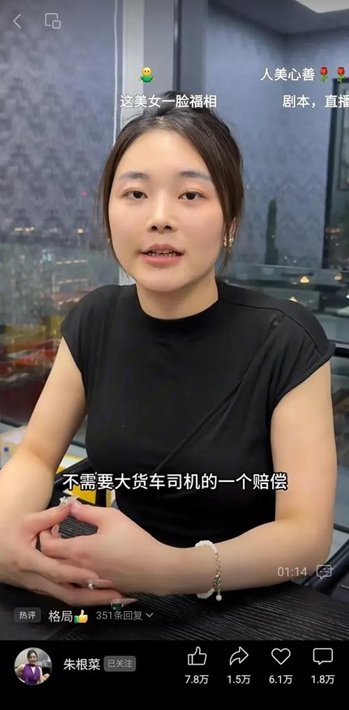 11月7日晚,劳斯莱斯女车主在个人社交账号“朱菜根”发布视频,回应此事后续,表示自己已经跟货车司机沟通过,决定不需要货车司机的赔偿,也不需要货车的保险来赔偿,自己去修就好了。“因为要他保险赔偿的话,他明年的保费会更贵。”