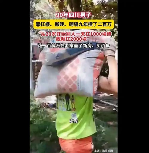 4月18日,据媒体报道,四川90后男子何先生靠抗楼、搬砖、砌墙,九年间攒了二百万,不抽烟、不喝酒,一年攒下20多万,攒到钱后他花一百多万在老家盖了新房、买了新车。何先生对记者表示,自己20岁开始干工地,别人一天抗1000块砖,自己就扛2000块,“只要努力干,一天挣1000块是有可能的。”