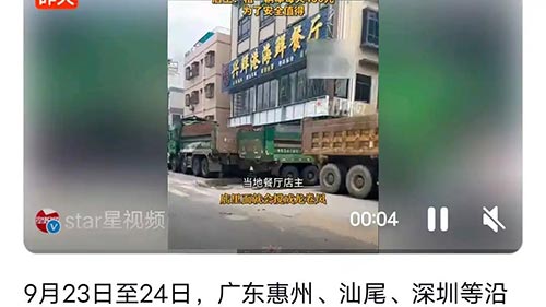 【广东多家餐厅租重卡停店门前】9月23日,超强台风“桦加沙”携17级狂风直扑广东沿海,一场关乎生命与财产安全的防御战全面打响。在惠州巽寮湾、汕尾金町湾、深圳盐田海鲜市场等地,一场独特的“重卡防御战”成为街头焦点——数十家餐饮商户租用重型卡车首尾相连,在店门前筑起近3米高的“钢铁屏障”,用最朴素却最硬核的方式,为玻璃幕墙和店内设施撑起“保护伞”。“宁愿多花点钱,也不能让门店被台风毁了!