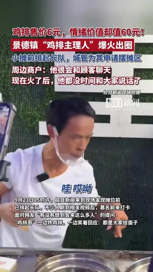 近日,江西景德镇。一位炸鸡排摊主爆火,他因亲切的服务态度、独特的经营方式以及快溢出来的情绪价值,吸引了一大波顾客,因工作太有原则被网友称为“鸡排主理人”“鸡排哥”。网友表示,6元的鸡排卖出了60元的情绪价值。