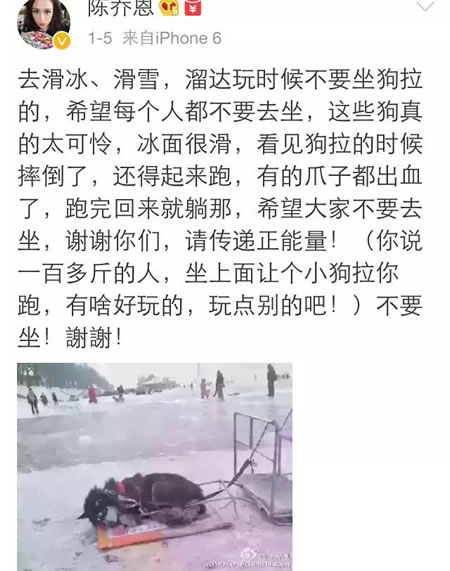 昨天陈乔恩上了热搜,原因是她发了一条微博,指责某旅游景点用狗狗拉雪橇。“狗狗真的太可怜了,一百多斤的人坐在上面让狗狗拉你,有啥好玩的,玩点别的吧。”但是呢,这条微博发完了之后,有一部分网友却并不买账,跑来怒呛……说“圣母”、“白莲花”啊什么的。还有更不靠谱的说“这是它的工作好吗?有啥可怜的,人都有累死的,更何况是狗。”