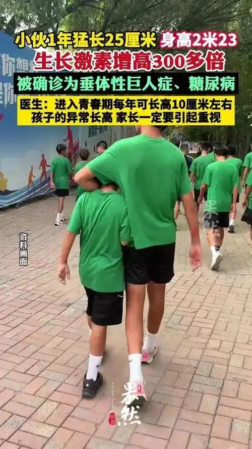 近日,浙江温州。20岁的小刘小时候并没有很高,但是进入青春期后,身高噌噌往上蹿,最快的时候一年长了25厘米,目前身高已达到223厘米。因为身高优势,小刘被送往体校打篮球,经过一段时间的训练和比赛,小刘出现了体力不支的情况,就医检查发现,小刘血糖水平极度增高,需要每天注射80单位胰岛素才能控制血糖,生长激素增高了300多倍,被确诊为垂体良性肿瘤、肢端肥大症和垂体性巨人症、糖尿病。经手术治疗,小刘身体各项指标均得到控制,目前已康复出院。