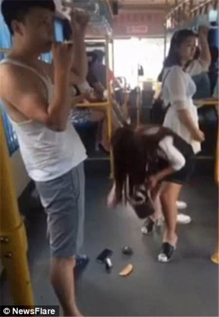 就在此时,车辆突然晃动了一下,女乘客没有站稳,直接倒向画面中的男乘客。然后,她顺势拽住了对方的裤子……