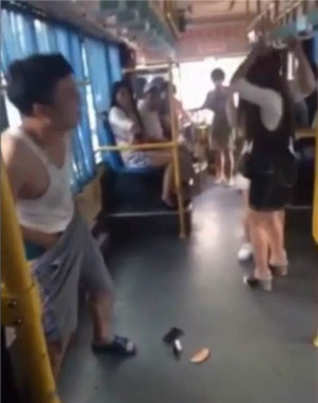 女乘客迅速起身,并向男乘客道歉,男乘客痛苦地提起了自己的裤子……
