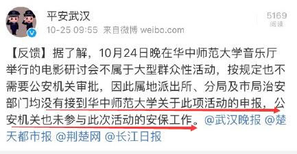 此次事件曝出后,引发广泛关注,据称范冰冰的离场是因为安保问题,有网友猜测是公安部门不给力,随后平安武汉发文称武汉安保部门并没有参与到当天的安保工作,也有网友出面称华中师范大学工作未做好。对此,华中师范大学也于晚上19:43分,在官微发布声明进行澄清说明。
