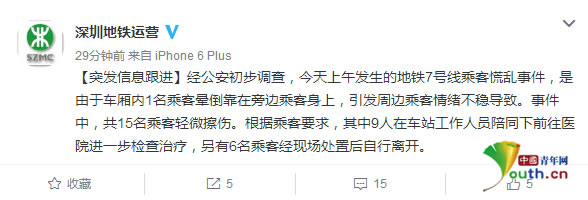 7月20日上午,深圳地铁官方微博发布通报,称7月20日早上8点30分,车厢有一名乘客不明原因奔跑,使人群受到惊吓引发慌乱,导致15名乘客轻微擦伤,事发后立即拨打120和地铁公安热线。