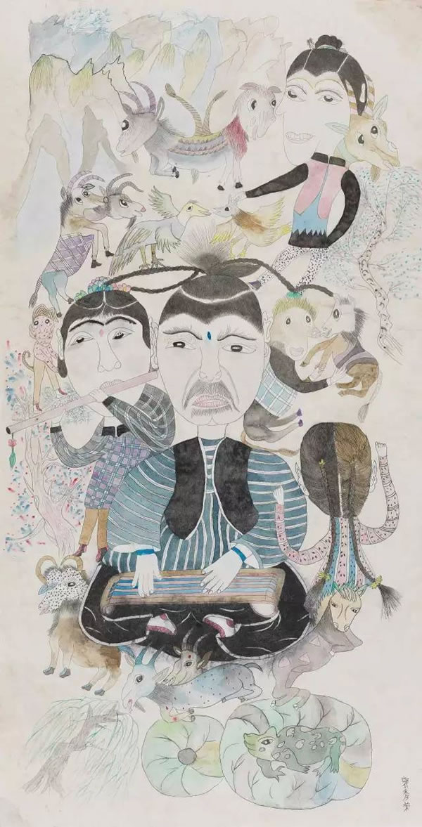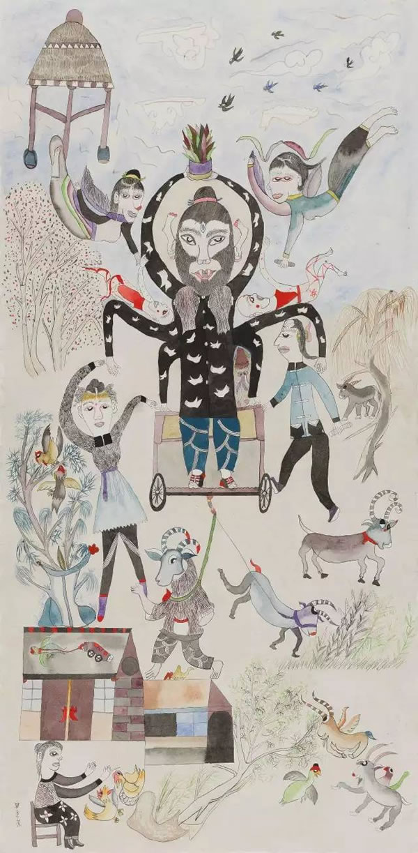 郭秀荣的画只有一个主题,就是乡野。画的内容荒诞的如山海经一样,大抵源自她幼时在农村里听说过的离奇故事。画面上语言的朴素自不必说,单就是那些奇奇怪怪的人,趣味超然的动物,五彩斑斓的房舍,东倒西歪的树和庄稼,便足以惊爆眼球。