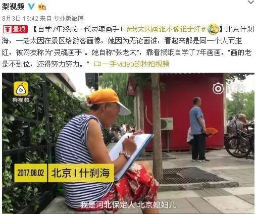 有网友称在北京什刹海一带游玩时遇到了一位令人“哭笑不得”的画师。这名画师自称张老太,在前海游船码头附近为游人画像,每幅画像的收费为10元或20元。张老太在什刹海一带画像有7年,并自称跟人学过画素描。