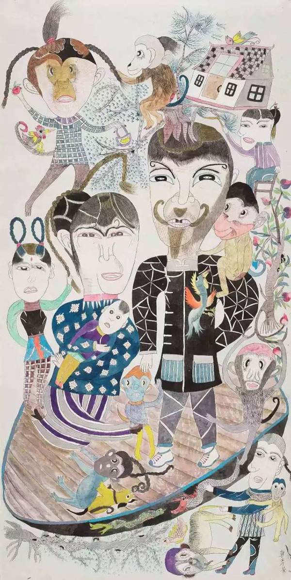没想到,一提笔就画了个光怪陆离的怪诞世界。她的画质朴天真、奇幻诡异,有着浓厚的原生态风格,令许多绘画名家啧啧称赞。