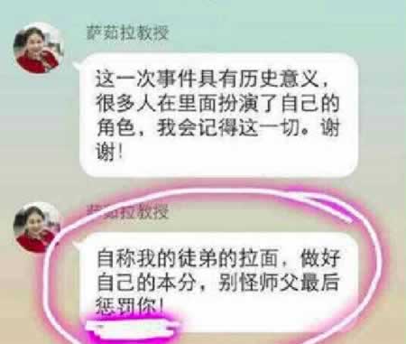 另一当事学生晓明(化名)表示,涉事教师萨茹拉曾在某个群里称会“惩罚”爆料学生,该群里基本都是她的粉丝,她表示“做好自己的本分,别怪师父最后惩罚你!”随后爆料人被清除出该群。