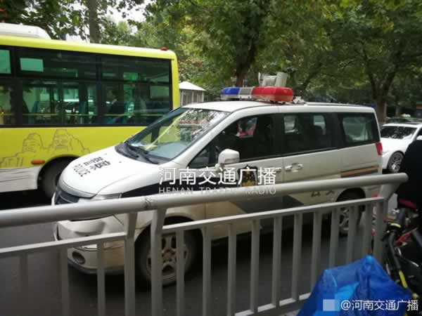 10月10日下午15时左右,在郑州友爱路嵩山路,一辆警车逆着行车方向停在路上,造成整条路堵死。