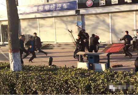 群众:4点多的时候路过建设东路,当时聚集了挺多的人。很大的一部分都是传销人员,在干警在跟他们说话的时候,他们突然有人喊“打他们”。这就他们挥动砖头、拿着洋灰块,咱们几个干警都被他们打伤了,这都是被害者,还有一个比我岁数小的头上挨了三砖。