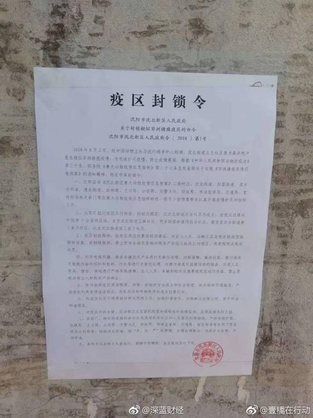 8月2日,经中国动物卫生与流行病学中心检测,沈北街道五五社区张某某养殖户发生疑似非洲猪瘟疫情。沈北新区人民政府决定组织成立应急处置小组,立即对如下区域进行封锁:以沈北街道五五社区为疫点,由疫点边缘向外延伸3公里的区域,东至沈北街道王驿社区,西至财落街道得胜社区,南至虎石台街道唐三家子社区,北至沈北街道三家子社区。疫情封锁期间,相关地区设立临时消毒站,检查站等,严格防止疫情势态加重。