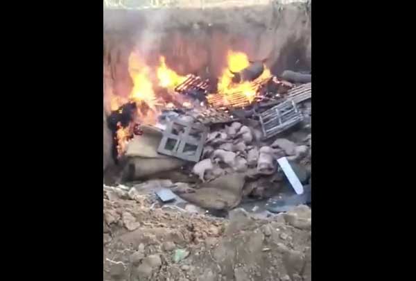 网传沈阳五五村突发非洲猪瘟疫情焚烧猪视频