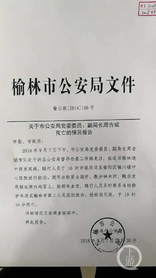 9月8日,一份榆林市公安局副局长周吉斌于9月7日下午突然死亡的报告在网上流传。