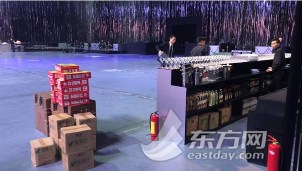 记者在会场中看到,近二十米长、七八米宽的舞台都已布置完毕,舞台两边的3个高清LED大屏幕上显示着相关活动宣传图片。而在舞台的下放,本已摆好的接待酒水、饮料及餐具,都在陆续被搬离。
