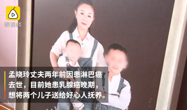 辽宁沈阳,孟晓玲的丈夫2年前因患淋巴癌去世,如今她又是乳腺癌晚期,家中育有两儿子,大的8岁,小的3岁。孟晓玲说,孩子现在还小需要人陪伴,心愿是将两个儿子送给一个好人家抚养,这是对他们做的最好的决定……