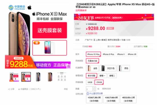 此外,中国移动手机旗舰店在天猫上架了256G iPhone XS MAX移动版,线上仅在天猫销售,售价仅为9288元,价格创新低。