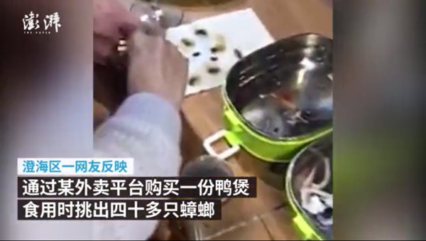3月5日,广东汕头。澄海区一顾客通过某外卖平台,购买鸭煲食用时挑出40多只蟑螂。6日,商家致歉并回应,暂停营业15天。区食药监人员告诉澎湃新闻,已介入调查。