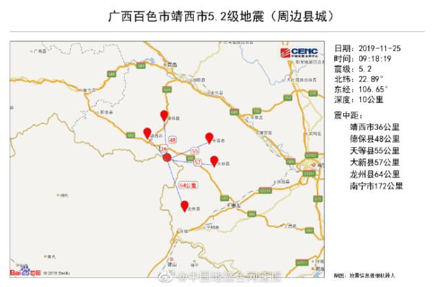 据地震信息播报机器人,震中距靖西市36公里、距德保县48公里、距天等县55公里、距大新县57公里、距龙州县64公里,距崇左市93公里,距南宁市172公里。