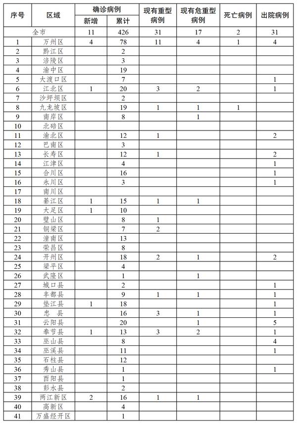 新增确诊病例中,万州区4例、江北区1例、綦江区1例、大足区1例、垫江县1例、奉节县1例、两江新区2例;新增重型病例中,万州区1例、江北区2例、九龙坡区1例、綦江区1例;重型病例转普通型病例中,万州区1例、江北区1例、垫江县1例;新增危重型病例为两江新区1例;新增出院病例中,万州区1例、江北区1例、江津区1例、合川区1例、云阳县2例。
