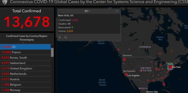 (观察者网讯)美国新冠肺炎确诊病例激增。据约翰斯·霍普金斯大学发布的实施查询系统,截至美东时间3月19日晚9点,美国累计确诊13678例,在不到24小时内新增确诊逾4000例。累计死亡则达到200人。