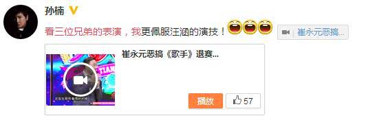 5月9日下午,孙楠在微博转发崔永元在某综艺节目上恶搞《歌手》退赛事件的视频,视频中崔永元为孙楠鸣不平,崔永元称“孙楠因为这个事饱受攻击,不过大家不要骂他,那是每个人的权利,他是个挺好的人”,孙楠在还附文写道“看三位兄弟的表演,我更佩服汪涵的演技。”