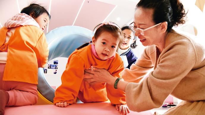 为解决0—3岁婴幼儿的照护问题,促进人口长期均衡发展,近年来,从中央到地方,各级政府相继出台政策鼓励和支持发展婴幼儿托育服务。图为2021年11月2日,在江苏省连云港市海州区新海街道小红花托育中心,小朋友在老师带领下快乐地做游戏。 求是图片 耿玉和/摄