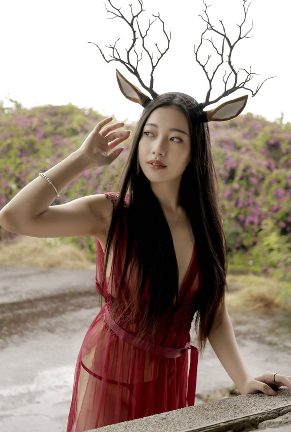 鹿角女孩夏暮光红纱透视长裙唯美无圣光图集