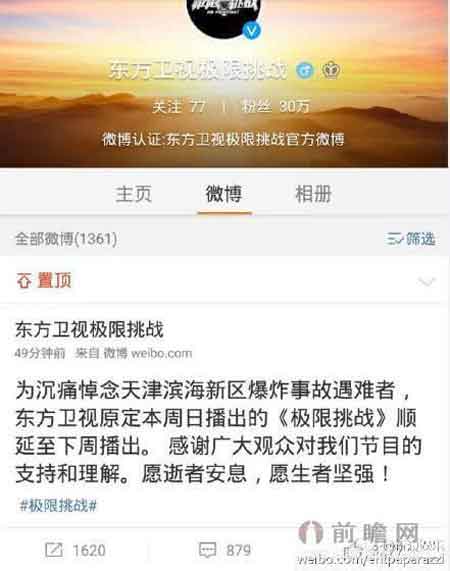 为天津祈福,突然刮起了一股“禁娱令”,一旦有明星在这个时间段内抢了天津爆炸的风头,就会被围攻辱骂,自发形成的禁娱令持续发酵,多档热门综艺节目陆续发布公告“停播”或“延播”,其中包括人气颇高的《极限挑战》和《真心英雄》。就停播热门综艺,网友有不同看法,有人认为这样做很对,全民祈福必须支持,让更多人关注这一事件;而大多数网友则认为没必要,放点娱乐节目还可以调节安抚难过的心情,与其停播综艺,不如电视台多捐点钱给遇难或受伤的消防官兵。
